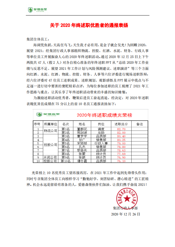 關(guān)于2020年年終述職優(yōu)勝者的通報(bào)表?yè)P(yáng)