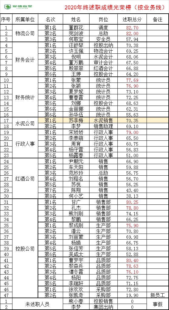 2020年終述職活動給參加的員工帶來了一場拓展知識、提升眼界的饗餐盛宴。因為它有利于公司團隊人才建設(shè)、有利于提升領(lǐng)導(dǎo)者的管理水平,有利于公司挖掘出人才。為激勵述職活動優(yōu)秀者、鞭策述職后進員工奮起直追。經(jīng)集團人事部三位成員細心、仔細的復(fù)核六位評委述職評分?jǐn)?shù)據(jù),最終于2020年12月26日公布了述職活動中“狀元、榜眼、探花”等,他/她們是董群花、宛劍波、曹夢宇、甘廣、宋嬌嬌、孔杰、黎森兵、張蒙、張穎、譚冬霞等十名優(yōu)勝者,具體詳見排名表。集團公司號召全體員工向“榜樣”學(xué)習(xí)“勤勉好學(xué)、刻苦鉆研、潛心精進”的工匠精神。機會永遠留給有準(zhǔn)備的人,愛德森堡伙伴們一起弘揚中國女排精神,讓我們攜手奮戰(zhàn)2021!