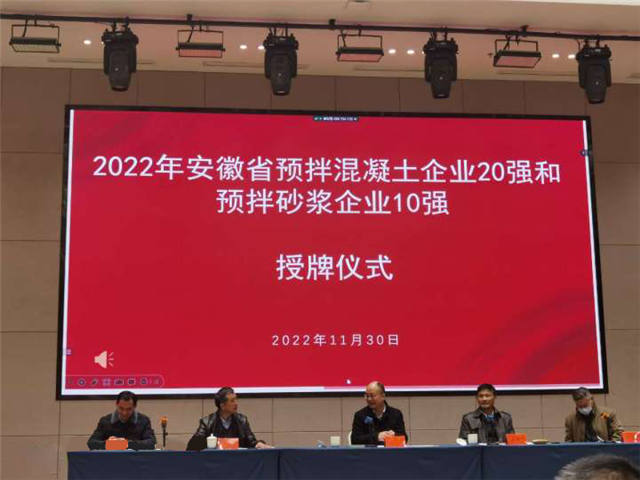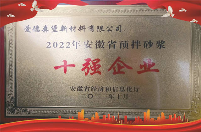 2022年11月30日,安徽省經(jīng)濟和信息化廳舉行了關(guān)于2022年安徽省預(yù)拌混凝土企業(yè)20強和預(yù)拌砂漿10強的授牌儀式,愛德森堡新材料有限公司市場事業(yè)部總裁陸鵬應(yīng)邀參加,我司賡續(xù)榮獲“2022年安徽省預(yù)拌砂漿十強企業(yè)”。